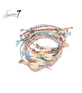 Gekleurde touw armbanden met een schelpen bedel. De lengte van de armband is circa 32 cm. De armbanden zijn nikkelvrij.