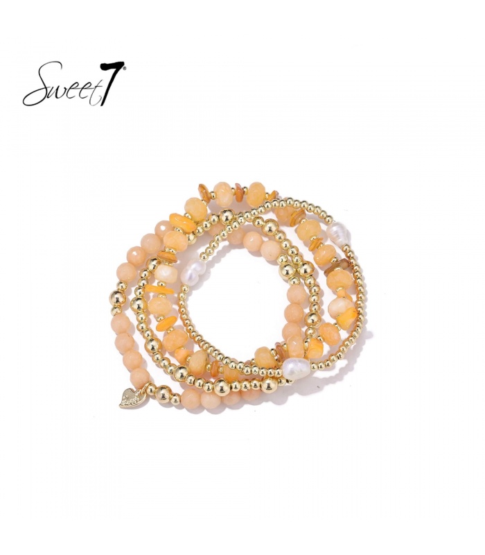 De zachte perzikkleurige kralen doen denken aan een warme zomerdag. Deze kralen armband straalt licht, warmte en elegantie uit. De goudkleurige details geven de armband een stijlvolle glans en maken het een echte fashion armband.