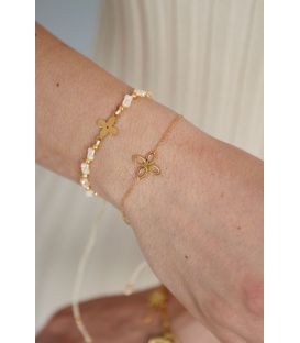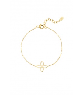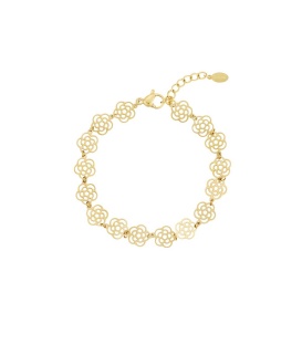 Goudkleurige armband met 5 bloemen bedels. De lengte van de armband is 16.50 cm + 5 cm verlengkettinkje. De armbanden zijn nikkelvrij.