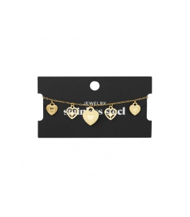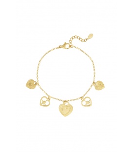 Verfijnde goudkleurige armband met harten bedels. De armband is versierd met verschillende hartjes bedels, elk met een unieke en verfijnde uitstraling. De hartjes symboliseren liefde en elegantie, waardoor deze armband een ideaal cadeau is voor een geliefde of een speciale aanvulling op je eigen collectie.