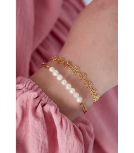 Goudkleurige dubbele armband met een parel. De lengte van de armband is 16.5 cm en een verlengkettinkje van 3 cm. De armbanden zijn nikkelvrij.