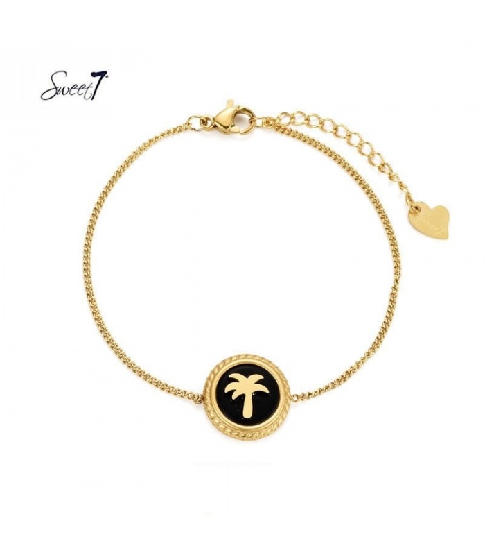 Goudkleurig armbandje met ronde zwarte bedel met palmboom