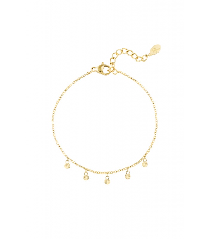 Trendy goudkleurige armband straalt elegantie uit met zijn vijf betoverende bloemen bedels. Elk detail is met liefde vervaardigd om een tijdloos stuk te creëren dat perfect past bij elke outfit en gelegenheid. Met zijn verstelbare lengte past deze armband moeiteloos om elke pols, waardoor het een veelzijdig en geliefd accessoire is.