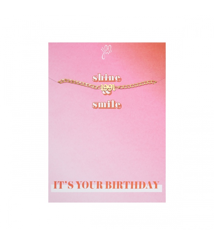 Goudkleurige armband met geboortejaar 1991 en verjaardagskaart.