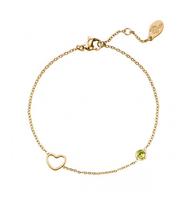 Goudkleurige armband met een groene geboortesteen van de maand augustus.
