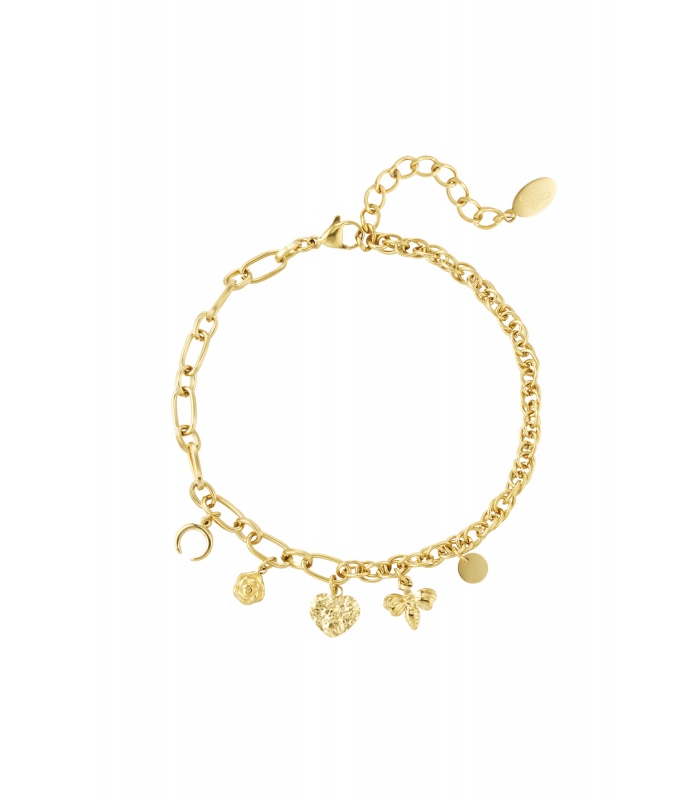 Onze goudkleurige armband is ontworpen om je pols te laten stralen. Het ontwerp bestaat uit verschillende schakels en bedels, waardoor het een unieke en trendy uitstraling heeft. De glanzende goudkleurige afwerking voegt een vleugje luxe en stijl toe, waardoor je er moeiteloos modieus uitziet.