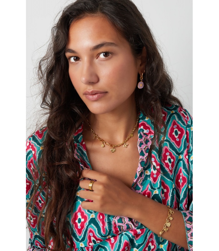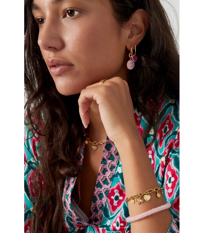 Hoe kan ik deze goudkleurige armband met verschillende schakels en bedels het beste stylen?
