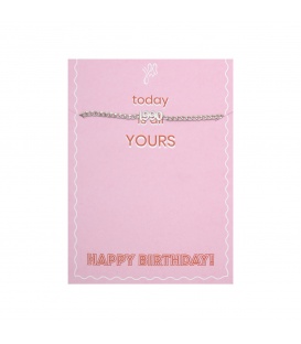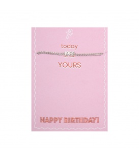 Zilverkleurige armband met geboortejaar 1986 en verjaardagskaart. De armband heeft een lengte van 16 cm. Nikkelvrij. Voorzien van een verlengketting van 3 cm.