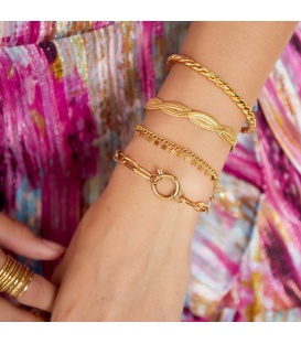 Zilverkleurige bangle met in het midden een goudkleurig motief. De lengte van de armband is circa 22 cm. De armband is nikkelvrij.