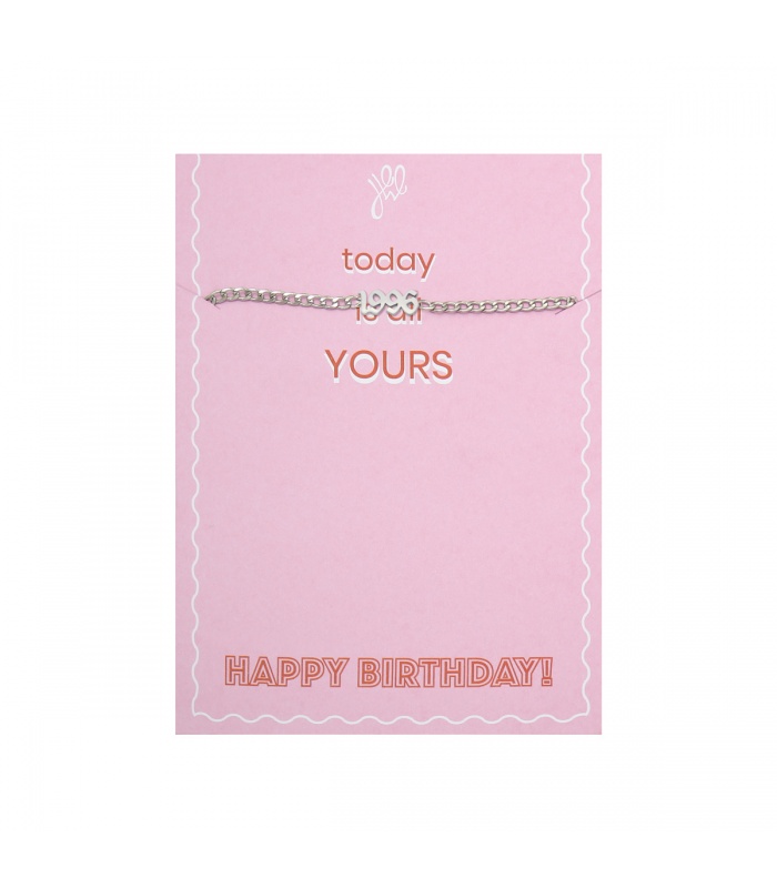Zilverkleurige armband met geboortejaar 1996 en verjaardagskaart.