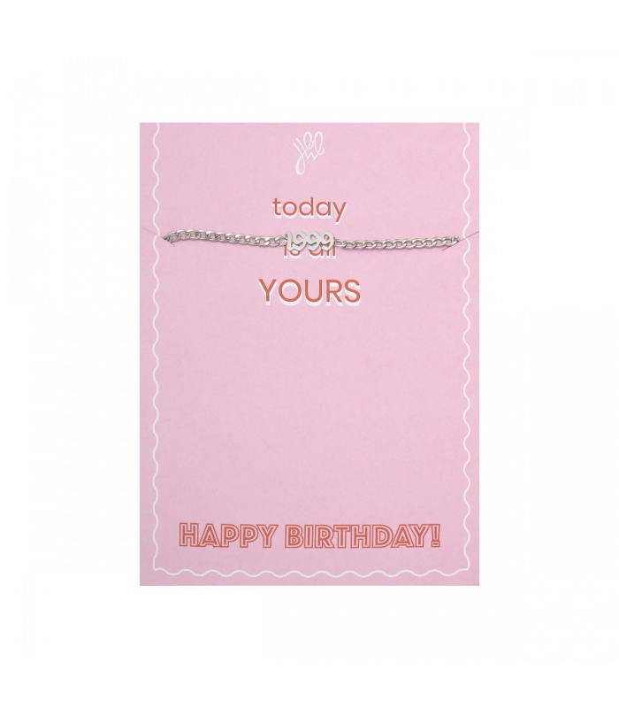Zilverkleurige armband met geboortejaar 1999 en verjaardagskaart.