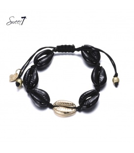 Zwarte schelpen armband met trek koord. De lengte van de armband is 16 cm. De armband is nikkelvrij.