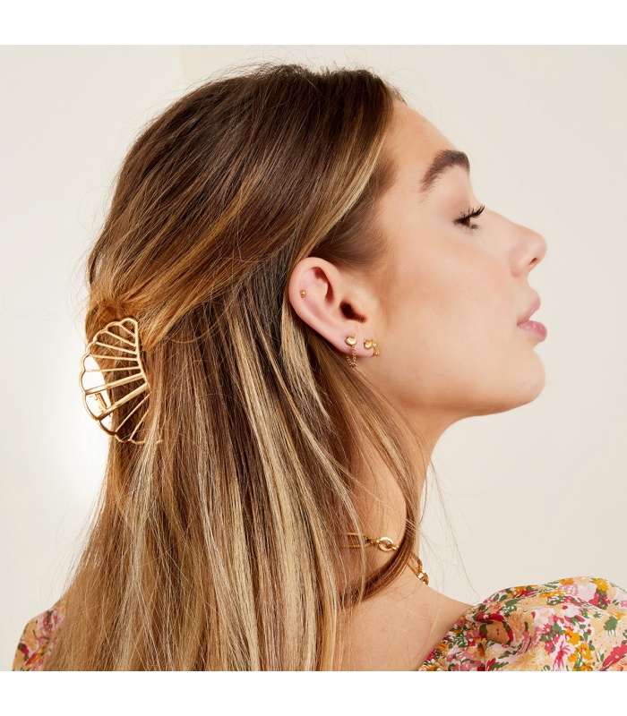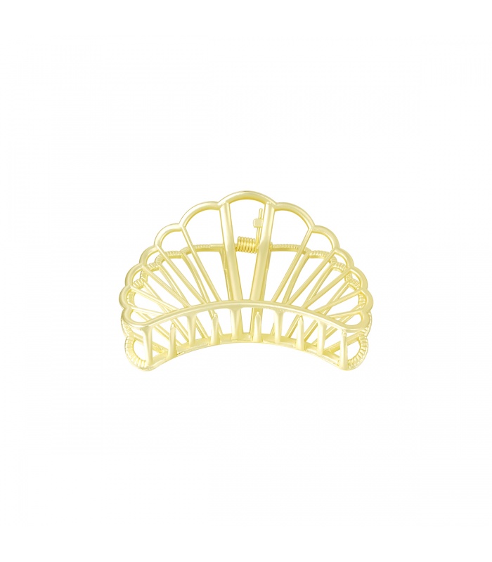 Shop deze ideale goudkleurige haarklem in schelpvorm nu bij Deoorbel.nl! De haarklem is perfect om jouw haren of een gedeelte ervan op een leuke manier op te steken. Daarnaast is de haarklem eenvoudig op te bergen in of aan jouw tas! De haarklem print is gemaakt van metaal en heeft een afmeting van 7.20cm x 3.80cm.