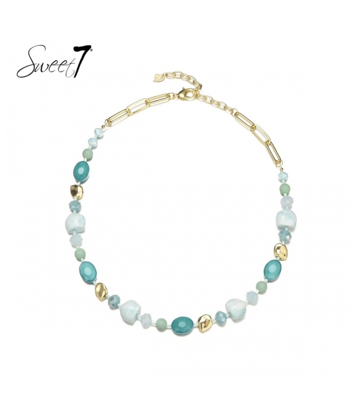 Blauwe korte halsketting van kralen en elementen.