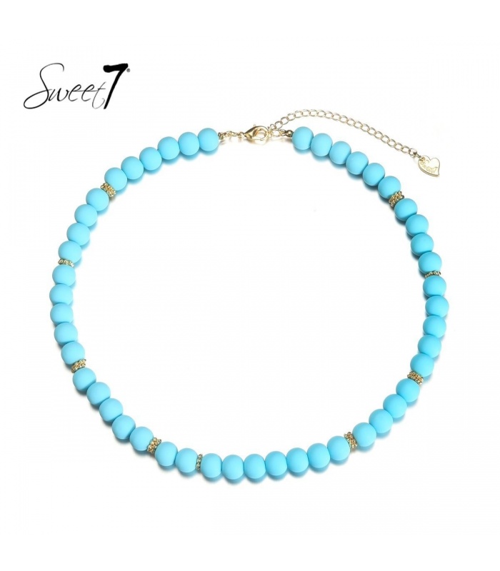 Maak een statement met deze prachtige blauwe korte kralen halsketting met goudkleurige elementen van het modieuze merk Sweet7.
