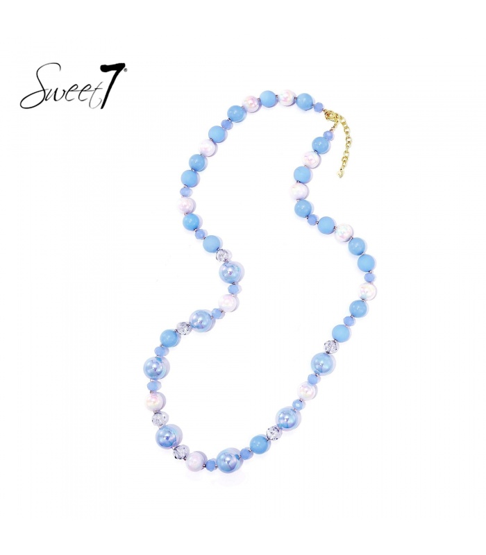Hoe voeg je kleur en zachtheid toe aan je look zonder te overdrijven? Deze halsketting combineert glanzende lichtblauwe kralen met witte accenten en transparante tussenkralen. Een verfijnde mix die direct opvalt.
