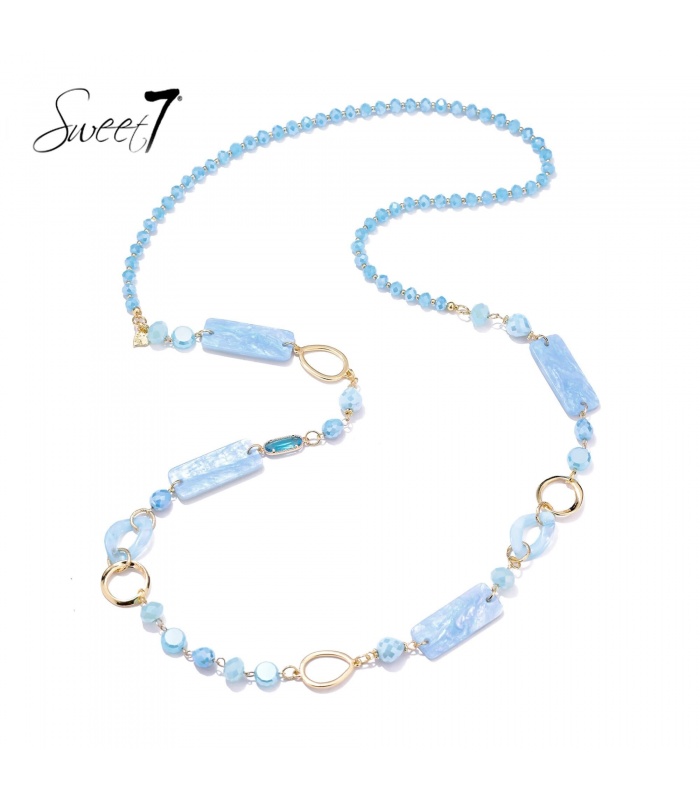 Het spel van ijsblauwe kralen, marmerlook elementen en goudkleurige accenten brengt een gevoel van rust en luxe samen. Deze halsketting straalt een serene elegantie uit, alsof je een stukje hemelblauw draagt. De langwerpige steentjes wisselen af met speelse druppelvormige schakels, wat het ontwerp een verfijnd karakter geeft. Een eyecatcher met een frisse, moderne uitstraling.