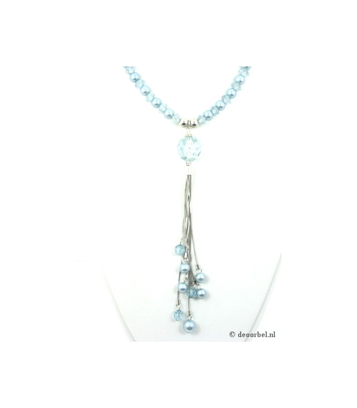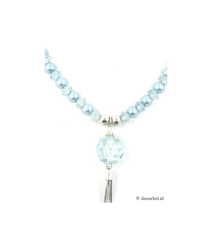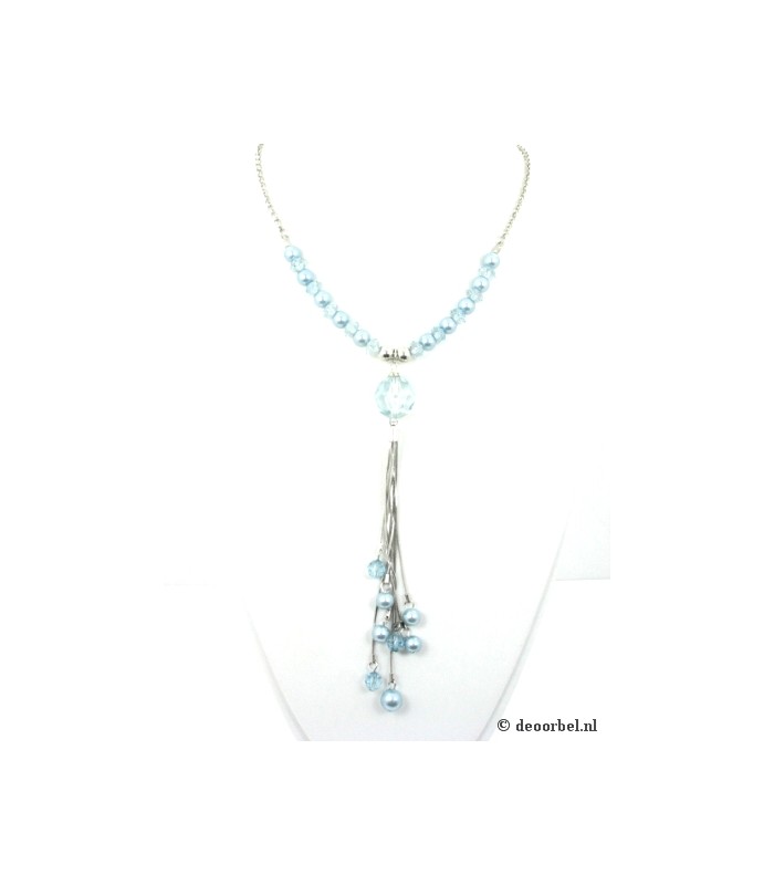 Zilverkleurige halsketting met ᅠblauwe en doorzichtige kralen. Lengte van de halsketting is 50 ᅠcm met een verlengkettinkje van ᅠ4 cm. De lengte van de hanger is 13 cm.