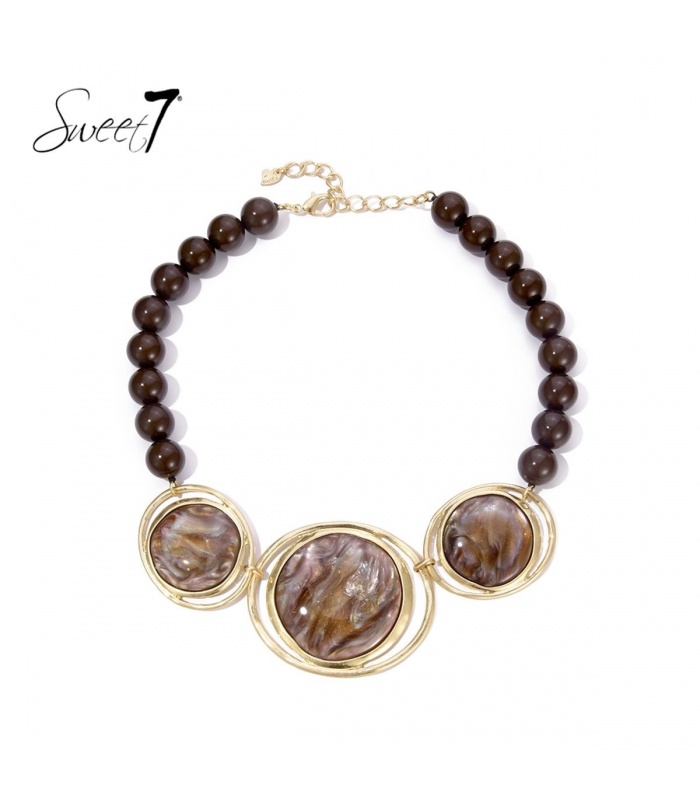 Zoek je een statement ketting die warmte en elegantie uitstraalt? Deze bruine halsketting van Sweet7 combineert ronde kralen met drie centrale elementen in marmerlook, omlijst met goudkleurige ringen. De diepe aardetinten zorgen voor een rijke, stijlvolle uitstraling die zowel overdag als s avonds tot zijn recht komt.