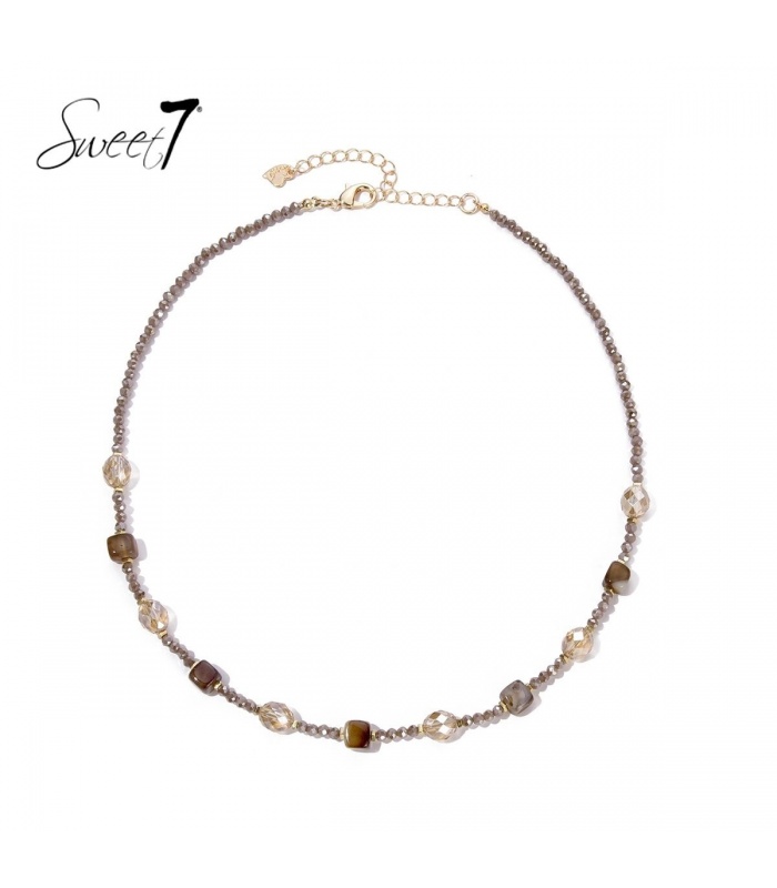 Zoek je een elegante halsketting die moeiteloos past bij elke outfit? Deze fijn afgewerkte ketting van Sweet7 combineert transparante kristalkralen met aardse bruintinten. De afwisseling van glanzende facetkralen en blokvormige accenten zorgt voor een stijlvolle balans tussen verfijning en naturel. Perfect voor dagelijks gebruik of als minimalistisch detail bij avondlooks.