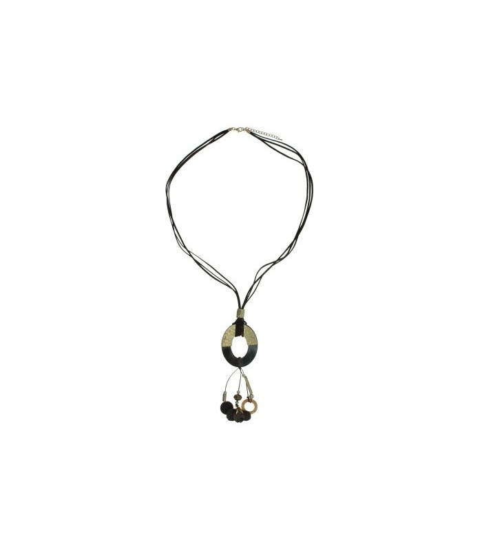 Mooie lange koord halsketting met ovale hanger, kwast en kralen.