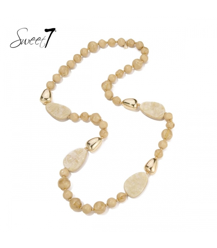 Op zoek naar een ketting die moeiteloos elke outfit versterkt? Deze halsketting in warme beige tinten combineert glanzende kralen met grove natuursteen-look elementen en goudkleurige accenten. De zachte kleuren en organische vormen geven een natuurlijke luxe uitstraling.