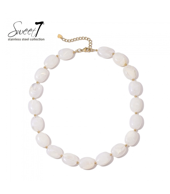 Deze halsketting bewijst van wel. De gladde, melkachtige kralen hebben een parelmoerachtige glans die direct het licht vangt. Goudkleurige accenten tussen elke kraal zorgen voor een stijlvolle onderbreking en een luxe uitstraling.