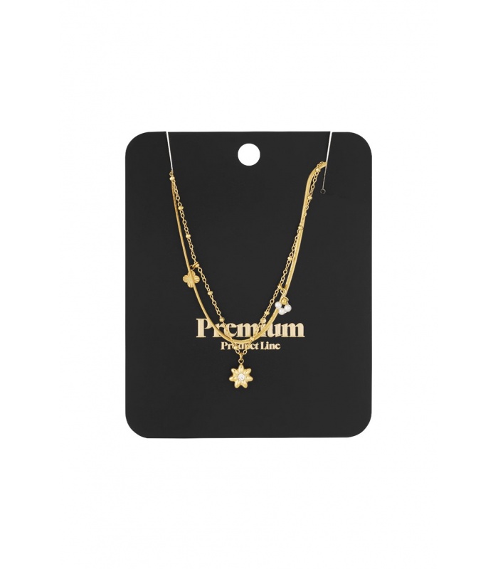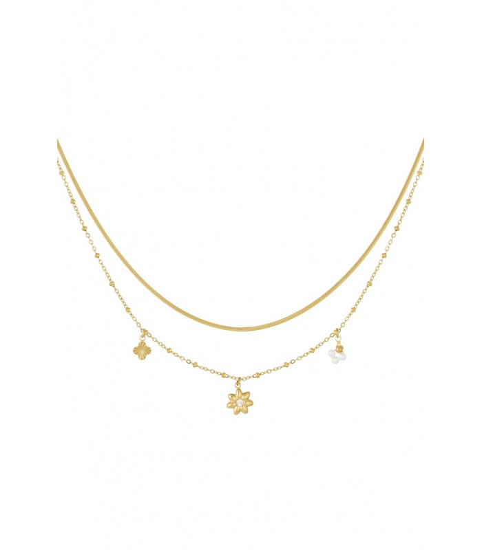 Deze stijlvolle halsketting bestaat uit twee goudkleurige lagen, elk versierd met unieke bedels die zorgen voor een speelse en modieuze uitstraling. De combinatie van de dubbele ketting en de gevarieerde bedels maakt dit sieraad tot een veelzijdige toevoeging aan je sieradencollectie.