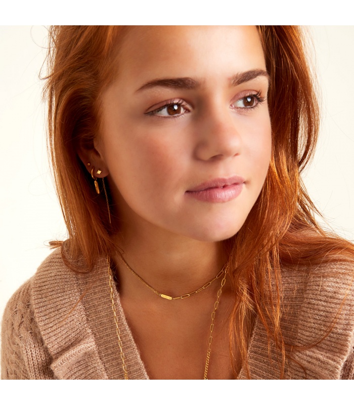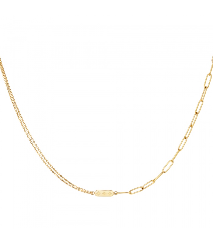 Goudkleurige halsketting met dubbele ketting en bedel met sterretjes.