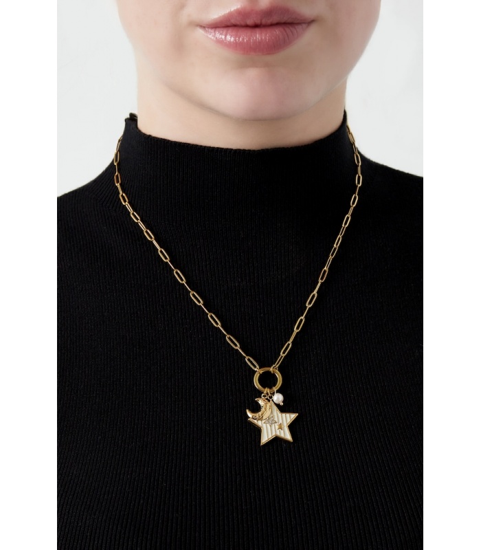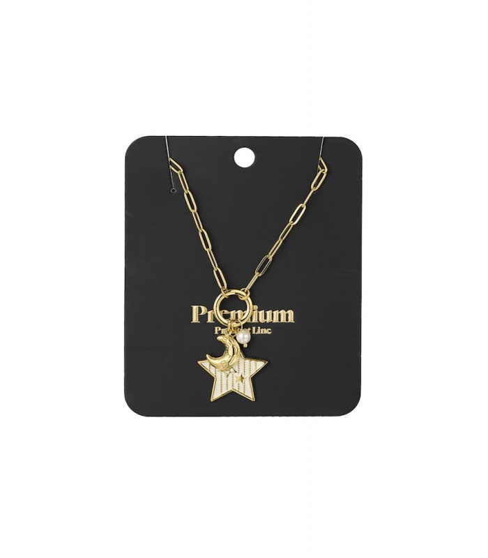 Deze elegante goudkleurige halsketting is voorzien van delicate hangers in de vorm van een ster en een maan, wat een subtiele en stijlvolle uitstraling geeft. Het tijdloze ontwerp maakt het een veelzijdig accessoire dat zowel bij casual als formele outfits past.