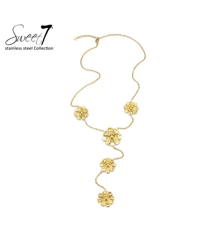 Mag een halsketting meer zijn dan een sieraad? Deze verfijnde creatie uit de stainless steel collectie van Sweet7 vertelt een verhaal van bloei en elegantie. De vijf goudkleurige bloemen dansen speels over de borstlijn en geven elke beweging een vleugje romantiek. Perfect voor wie zich graag vrouwelijk én krachtig wil voelen.