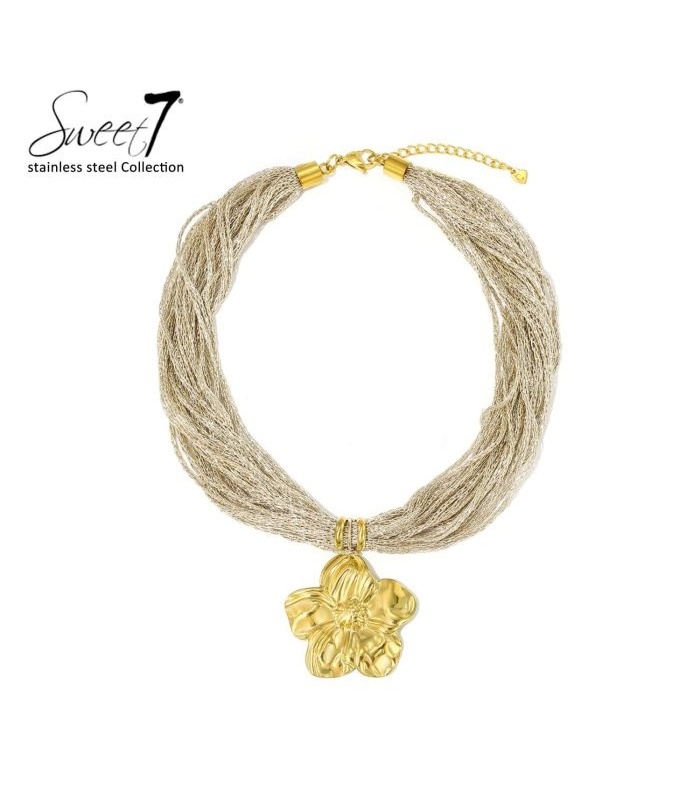 De combinatie van fijne mesh strengen en de opvallende goudkleurige bloem geeft deze ketting iets krachtigs en zachts.