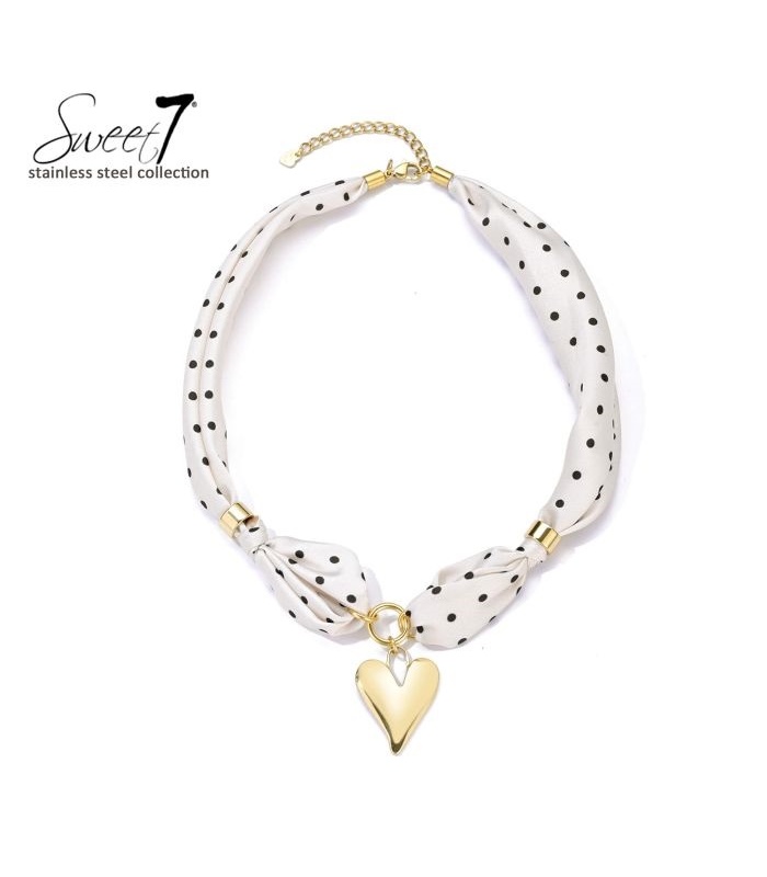 Hoe combineer je elegantie met een knipoog naar retro fashion? Deze halsketting doet het perfect. De satijnachtige sjaal met zwarte stippen zorgt voor een vintage flair, terwijl het glanzende gouden hart subtiel de aandacht trekt. Een charmante blikvanger voor wie durft te flirten met haar stijl.