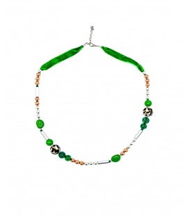 Zilverkleurig korte ketting met ronde hanger van synthetisch malachiet