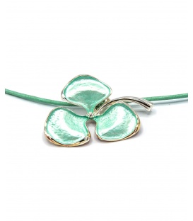 Zwarte koord halsketting met een groene bloem. De lengte van de halsketting is circa 100 cm.