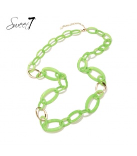 Groene korte schakel halsketting met goudkleurige elementen. De lengte van de halsketting is circ45 a 50 cm. De ketting heeft een verlengkettinkje van 5 cm.