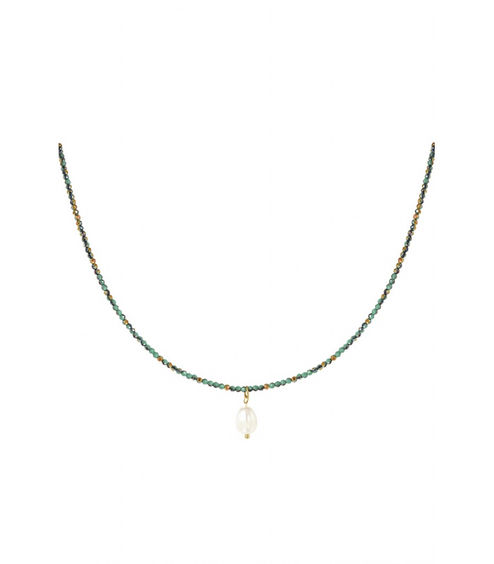 Donkergroene glaskralen halsketting met een parel als hanger.