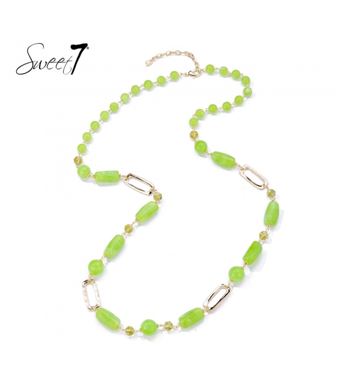 Hoe laat je jouw outfit spreken met één sieraad? Deze halsketting in levendig limegroen trekt direct de aandacht. Afgewisseld met goudkleurige schakels en transparante kralen ontstaat een speels ritme dat perfect in balans is. Een frisse eyecatcher met moderne flair.