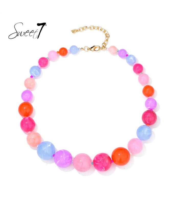 Hoe breng je direct vrolijkheid in je outfit? Deze halsketting van Sweet7 is pure kleurentherapie. De grote glanzende kralen in tinten roze, paars, rood, oranje en blauw creëren een speels ritme dat meteen opvalt. Elk kraaltje lijkt een eigen karakter te hebben, samen vormen ze een ketting vol levendigheid en optimisme.