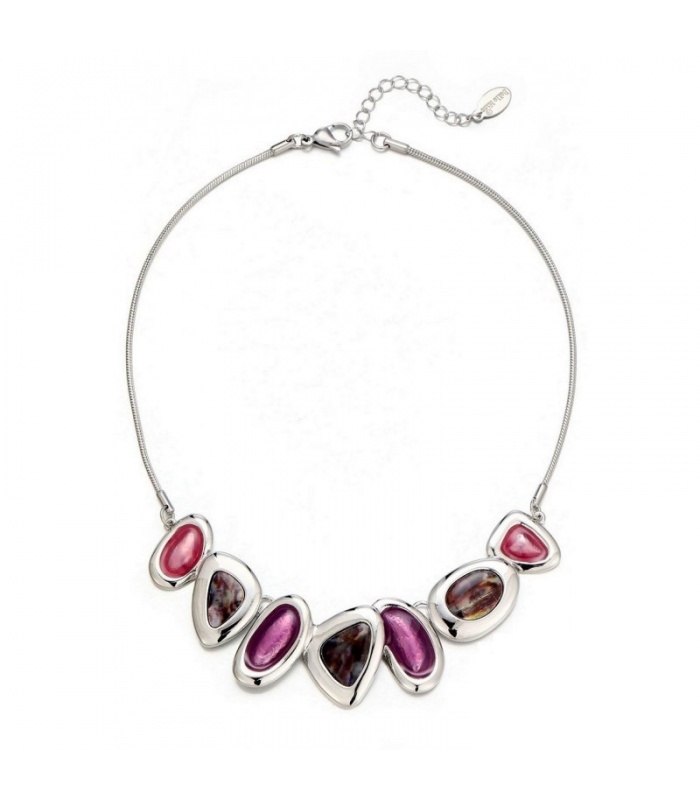 Wil je kleur toevoegen aan je look zonder in te boeten op stijl? Deze halsketting speelt met tinten roze, paars in speels gevormde elementen. De zilverkleurige omlijsting geeft het geheel een moderne, gepolijste uitstraling.