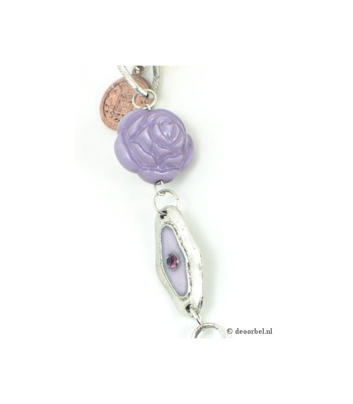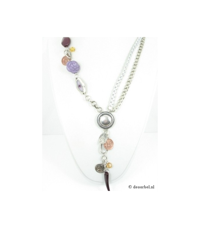 Zilverkleurige ketting metᅠpaarse accenten. Lengte van de halsketting isᅠ86 cm. Lengte van de hanger is 14 cm.