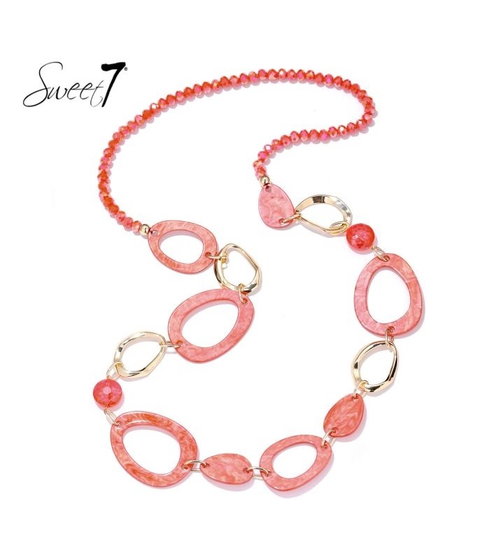 Hoe geef je je outfit in 1 beweging karakter? Deze opvallende halsketting van Sweet7 laat je stralen met levendig koraalrood, gecombineerd met goudkleurige schakels en transparante kralen. De marmerlook elementen zorgen voor een luxueuze twist, terwijl de organische vormen het speels en vrouwelijk houden. Perfect voor wie houdt van kleur en durft op te vallen.