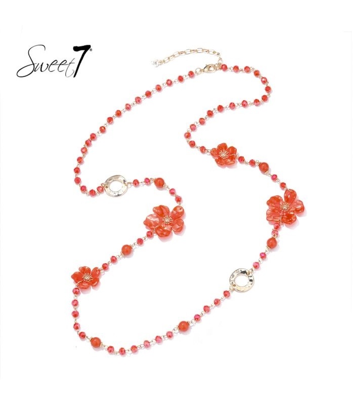 Deze dames ketting combineert fijne rode kralen met opvallende bloemen en subtiele metalen accenten. Licht en elegant, ideaal om solo te dragen. Een statement ketting die kleur en stijl toevoegt aan elke outfit. Maak je look compleet met deze eyecatcher.