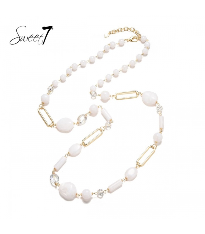 De charme van onze witte glas kralen lange halsketting, verrijkt met schitterende goudkleurige elementen. Dit must-have accessoire combineert klassieke elegantie met een moderne twist, ideaal voor elke fashionista die haar outfit een verfijnde touch wil geven. Met zijn tijdloze ontwerp past deze ketting perfect bij zowel casual als formele kledij.