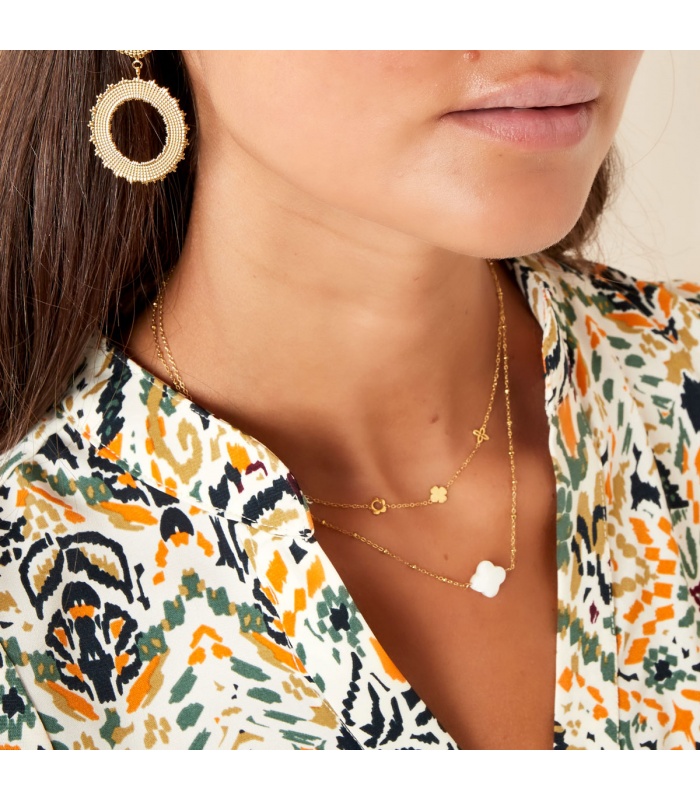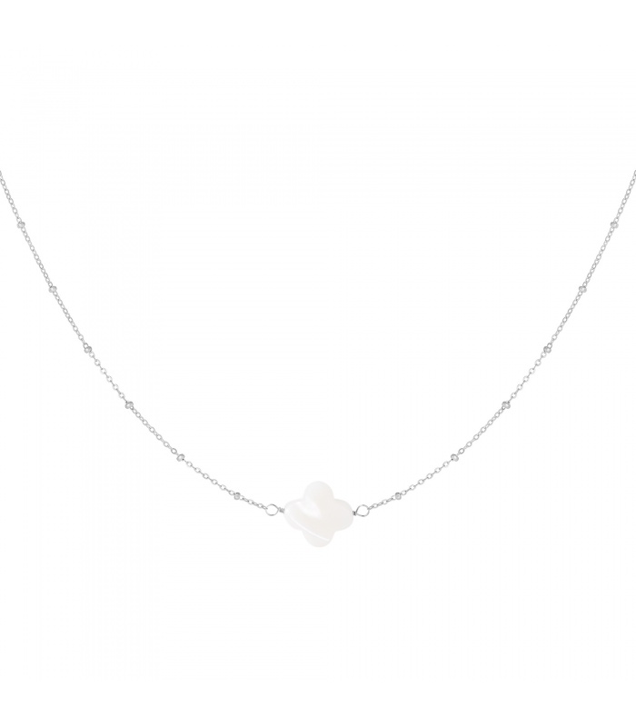 Zilverkleurige ketting met zeeschelpbedel in klavervorm