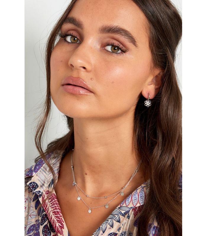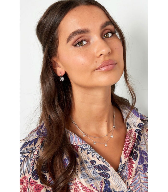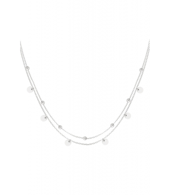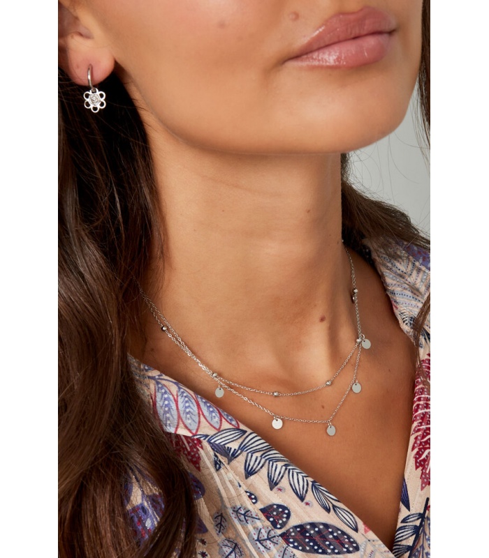 Zilverkleurige dubbele halsketting met hangende cirkels en bolletjes.
