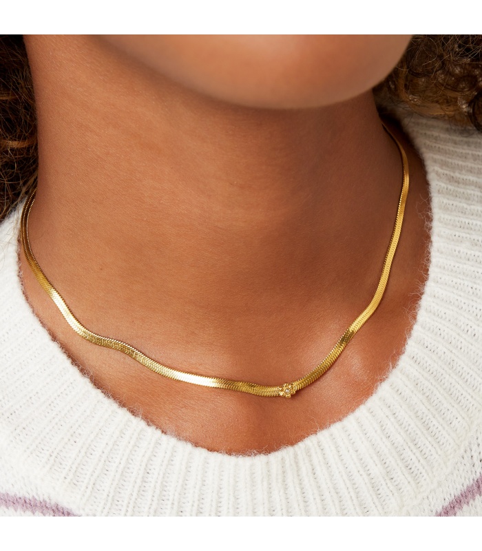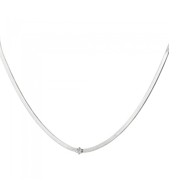 Zilverkleurige halsketting met een klein bloemetje en zirkoonsteentje.