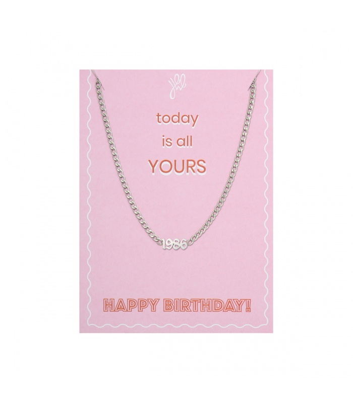 Zilverkleurige halsketting met geboortejaar 1986 en verjaardagskaart.