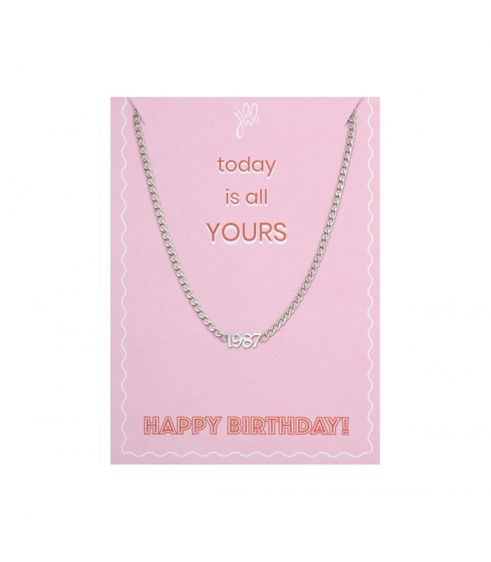 Zilverkleurige halsketting met geboortejaar 1987 en verjaardagskaart.