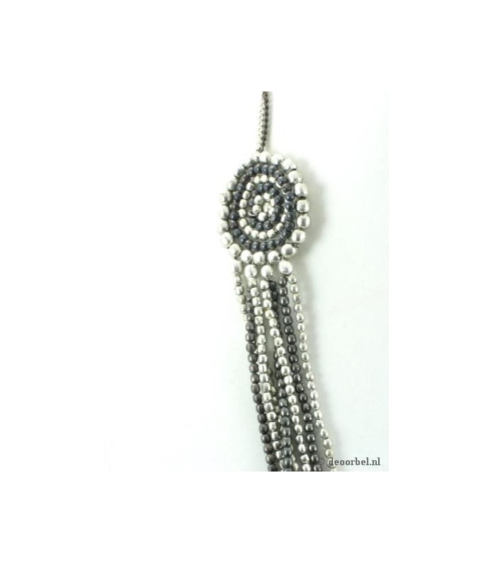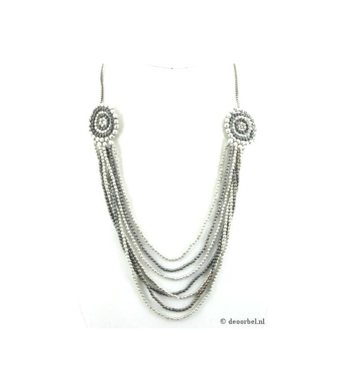 Zilverkleurige halsketting van kleine kraaltjes. Lengte van de halsketting is ᅠ47 cm.